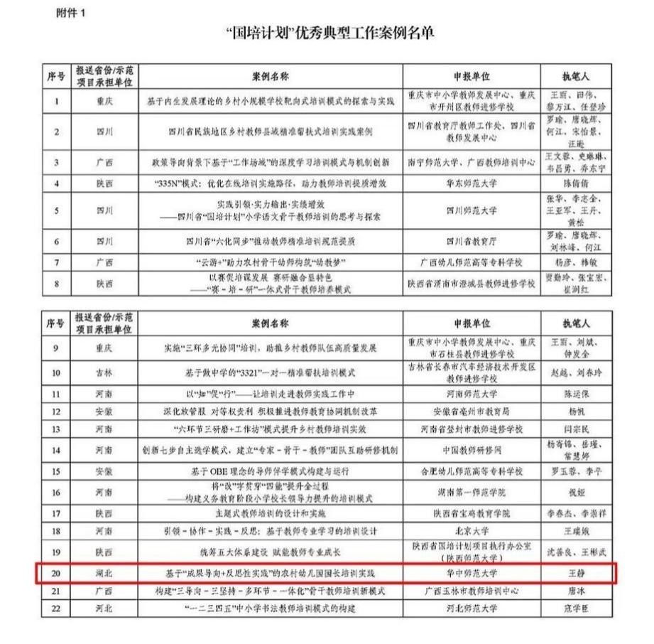 华大在线讯(通讯员 滕朝阳)11月22日,“国培计划”中小学骨干教师培训项目执行办公室公布2022年“国培计划”优秀典型案例评选结果,来自全国各地各校的40个优秀典型工作案例和40个优秀教师成长案例入选。由我校培训中心(职业与继续教育学院)报送的工作案例《基于“成果导向+反思性实践” 的农村幼儿园园长培训实践》是湖北省唯一入选案例。