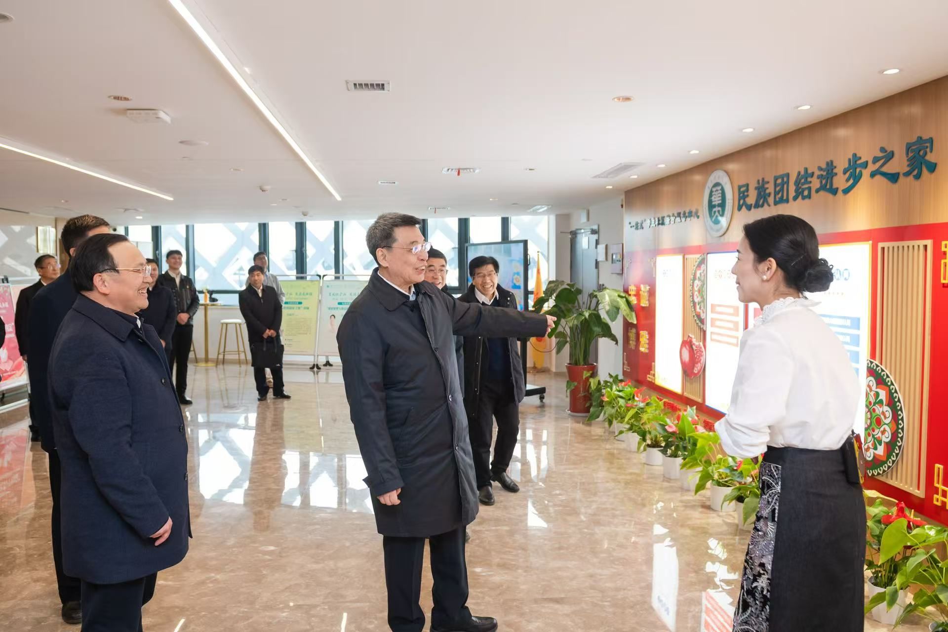 华大在线讯(记者 华轩)2月13日,中央统战部副部长,国家民委党组书记、主任潘岳来校调研,参观校史馆、美美与共民族团结工作室,听取我校民族团结进步教育工作以及jiuyouhui.com湖北省铸牢中华民族共同体意识基地建设情况汇报。湖北省委统战部副部长、省民宗委党组书记、主任沙玉山,武汉市委统战部副部长,市民宗委党组书记、主任朱绍华,校党委书记夏立新,校长彭双阶,校党委副书记查道林、陈迪明等陪同调研。