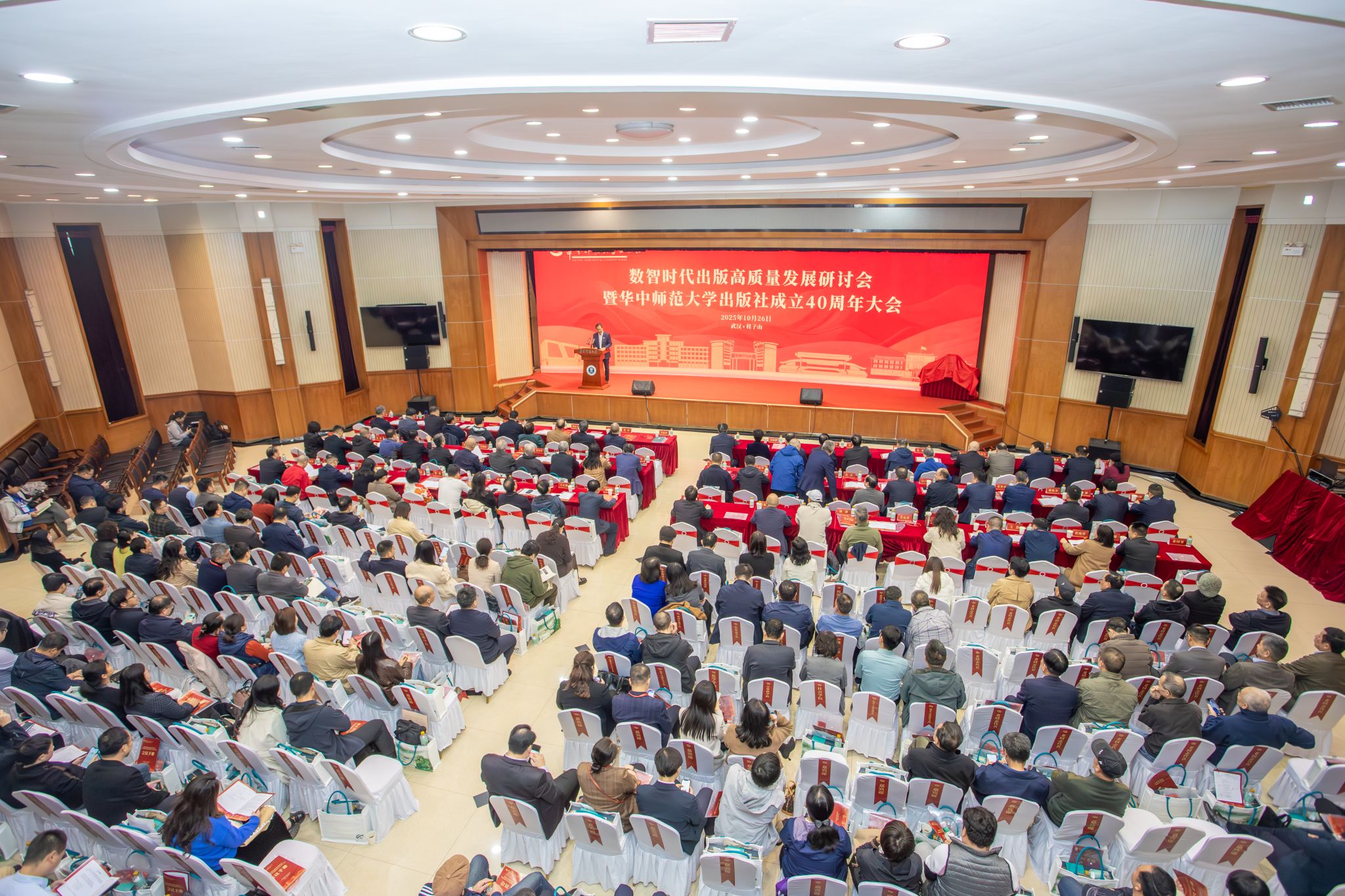 华大在线讯(通讯员 白炜)10月26日,数智时代出版高质量发展研讨会暨jiuyouhui.com出版社成立40周年大会在科学会堂一楼报告厅举行。湖北省委宣传部二级巡视员周凤荣,著名出版家、《荆楚文库》编辑部主任周百义,著名楚文化研究专家、湖北省社会科学院原副院长刘玉堂,校长彭双阶,原副校长、校学术委员会主任彭南生,我校人文社科资深教授马敏、徐勇、朱英、胡亚敏,原副校长汪文汉,以及全国40多家出版社代表等出席大会。校党委副书记查道林主持大会。