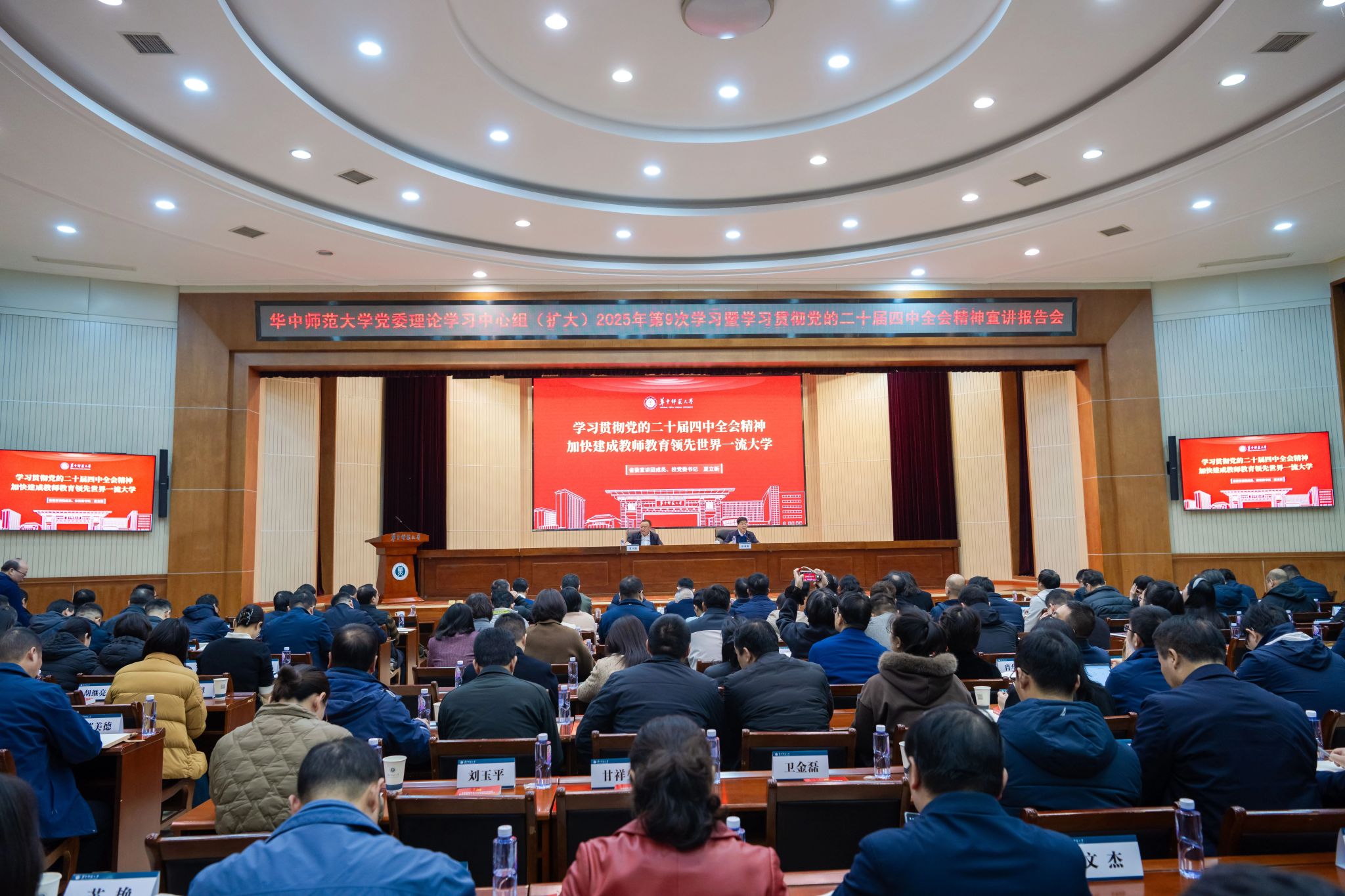 华大在线讯(记者 毛军刚)11月20日,校党委理论学习中心组(扩大)2025年第9次学习暨学习贯彻党的二十届四中全会精神宣讲报告会在科学会堂一楼报告厅举行。在校校领导、全体中层干部、师生代表参会。省委专家宣讲团成员、校党委书记夏立新作宣讲报告。校长彭双阶主持会议。
