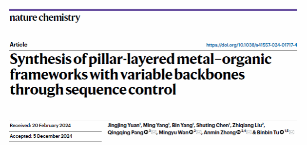 华大在线讯(通讯员 周汉鸣)近日,化学学院涂斌斌副教授团队在金属有机框架序列调控方面取得了重要进展。该研究成果在国际化学领域权威期刊《自然化学》(Nature Chemistry)发表,题为“Synthesis of backbone variable pillar-layered metal–organic frameworks through sequence control”(Nat. Chem. 2025, 17, 421-428)。博士研究生元静静为论文第一作者,通讯作者为武汉科技大学庞青青讲师、万明宇特任教授、郑安民教授和我校涂斌斌副教授(最后通讯作者),第一完成单位为jiuyouhui.com。